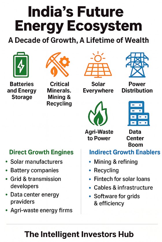 India has already auctioned 34 blocks of critical minerals and is acquiring lithium assets abroad. Mining, refining, and recycling companies will quietly power everything from EVs to smartphones to solar batteries. - Solar Everywhere