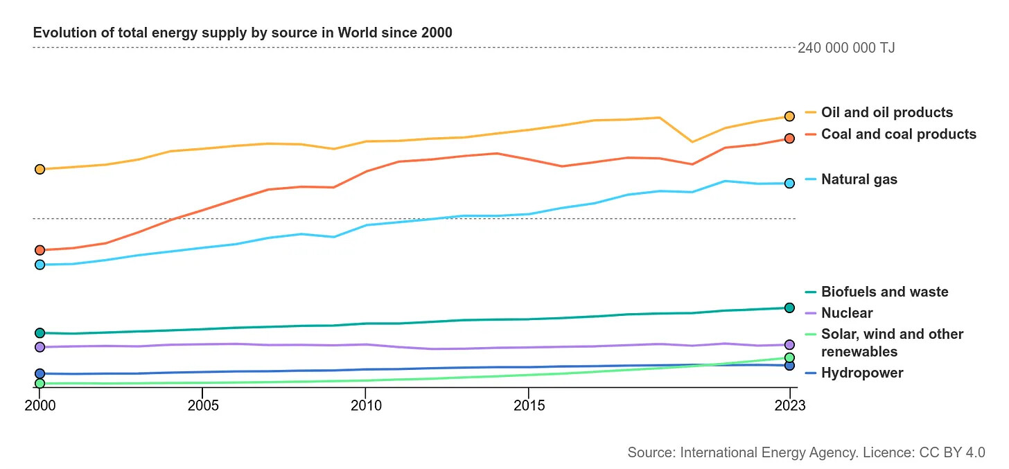 But the relevant question for a country like India isn’t whether renewables will grow - undoubtedly, they will. The question is whether they can serve the energy needs of a large, industrializing nation alone. Despite decades of growth, solar and wind still contribute less than 7% of global primary energy. As Smil writes, “Energy transitions have been, and will continue to be, protracted affairs because of the enormous scale of the shift. ”