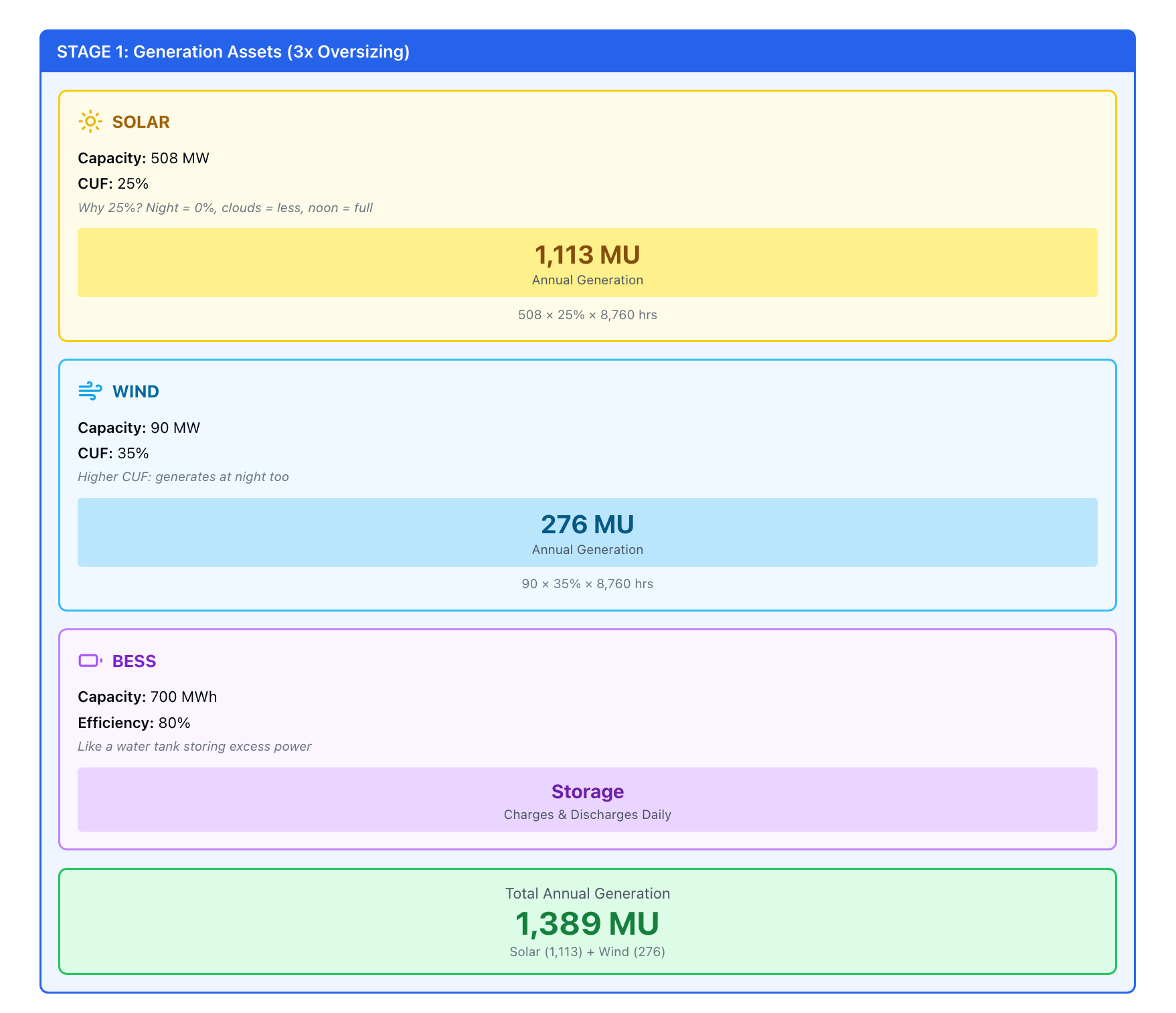 - Solar Generation: 508 MW × 25% × 8,760 hours = 1,113 MU per year (On average, producing 127 MW every hour, all year long)