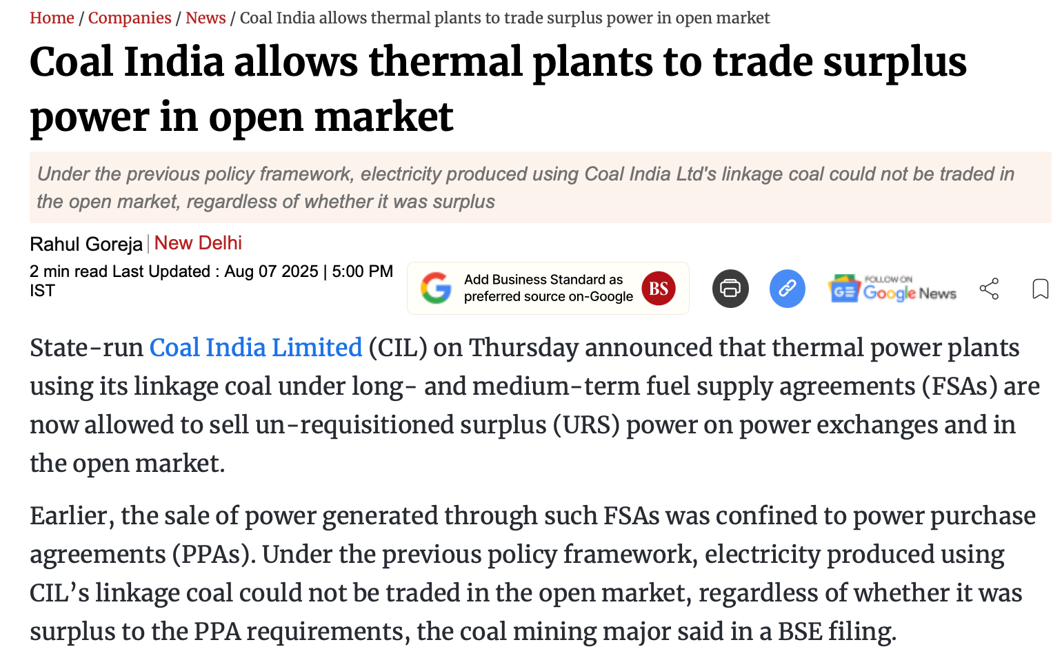 Mandated Supply: The Government of India has mandated that all thermal generating stations must offer unrequisitioned surplus power on exchanges. Subsequently, Coal India allowed open market sale of surplus power under FSA.