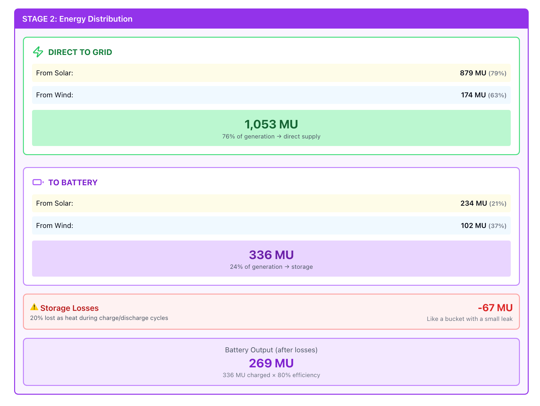 Why does wind contribute proportionally more to storage (37% of its output) compared to solar (21%)? Wind generation often peaks during nighttime hours when demand is low, requiring more storage. Solar generation aligns better with daytime demand, allowing more direct supply.