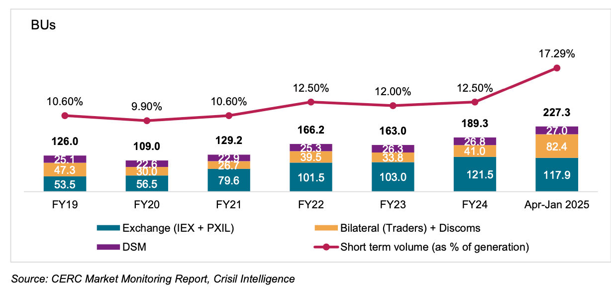 The share of transactions through power exchanges has grown at 18% CAGR - from 54 BU in FY19 to 122 BU in FY24.
