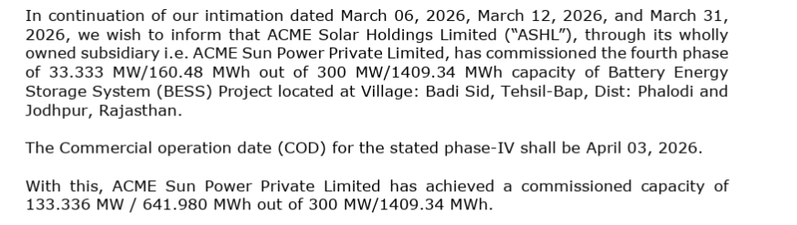- Phase-IV: 33.33 MW / 160.48 MWh added