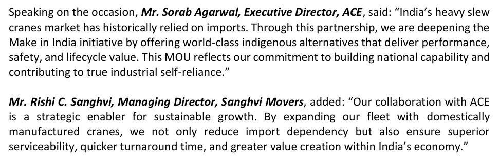 ACE & Sanghvi Movers Limited Sign Strategic MOU of Indigenously