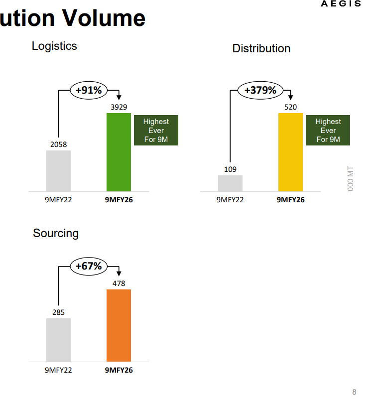 AVTL has only 71,000 MT static capacity (Kandla & Pipavav) compared to Aegis 119,000 MT, so the revenues are difficult to compare. Also AVTL gas division revenue was 276Cr for FY25.
