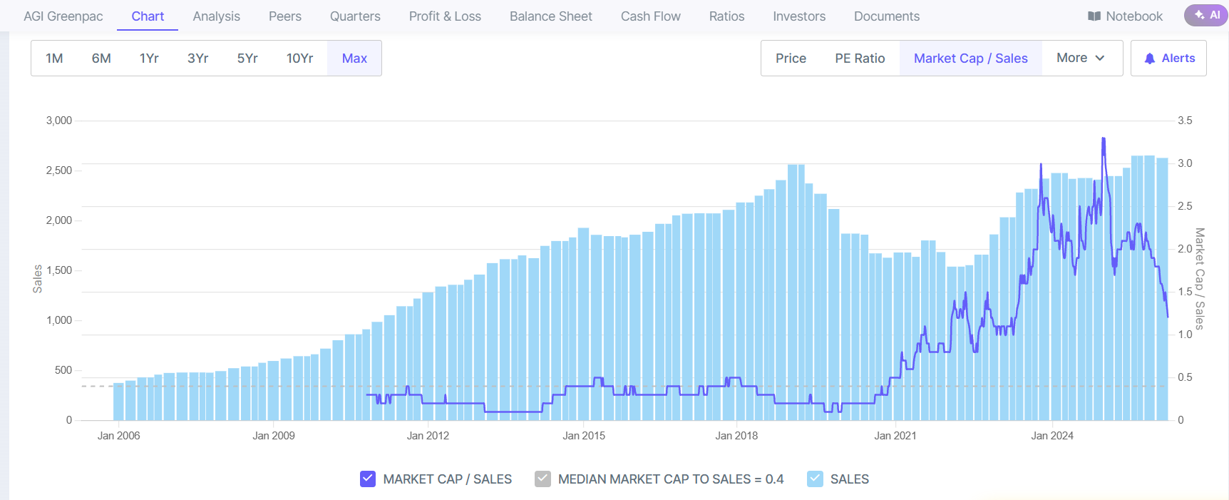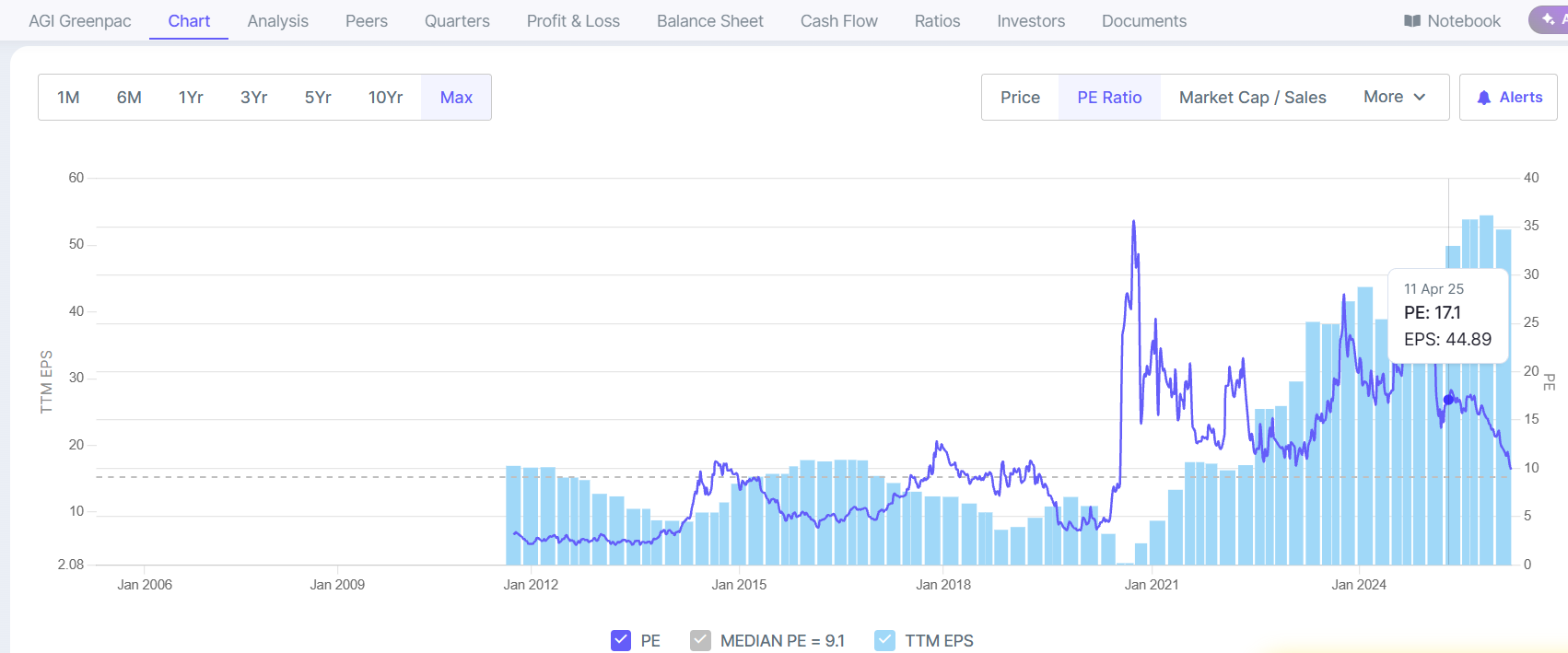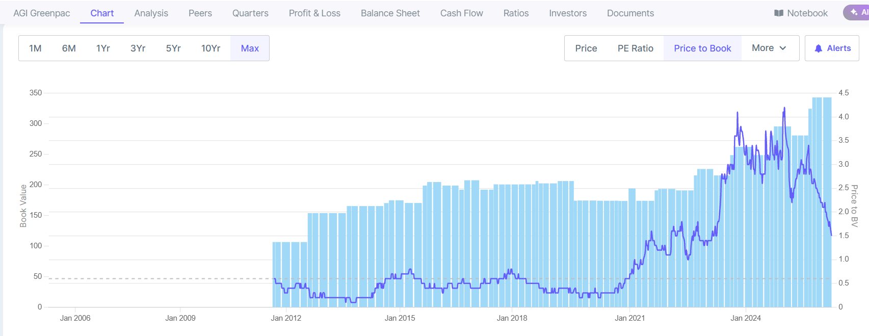 Looking at “Max” charts will be incorrect as the company , “AGI greenpac” came into existence post demerger from HSIL in 2019 Only. Even after 2019 till 2022 it was carrying a vary heavy “load” of being TOLL/contract manufacturer of HSIL bath ware/kitchenware etc with ultra low margin. The REAL demerger happened only in 2022 when these heavy assets were transferred back to Hindware home innovation limited post Covid. So, look from 2022. The current fall may be triggered by its deletion from MSCI Global Smallcap index which meant passive ETF outflows. It may also get deleted from NIFTY smallcap index. It is one of the most efficient Glass manufacturer globally. The Multifuel furnaces allows it run on multiple kind of fuels and unlike HNG - Which may face shutdown/slowdown due to Gas shortages post Iran war, it shall continue with electricity and/or Biofuels.