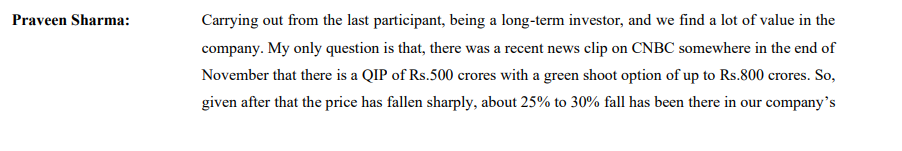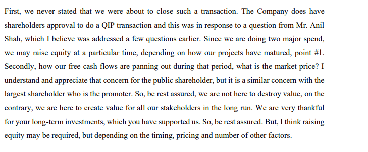 - Aggressive capex may lead to 1000-1200 Cr in debt/ equity dilution as indicated by management in concall.