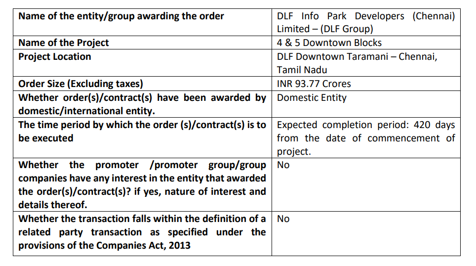Order flow continues to be strong across the industry. Innovators has received the Letter of Intent for Work Order of Design, Supply, Installation & Commissioning of Façade Glazing Works from DLF Group- again from Chennai.