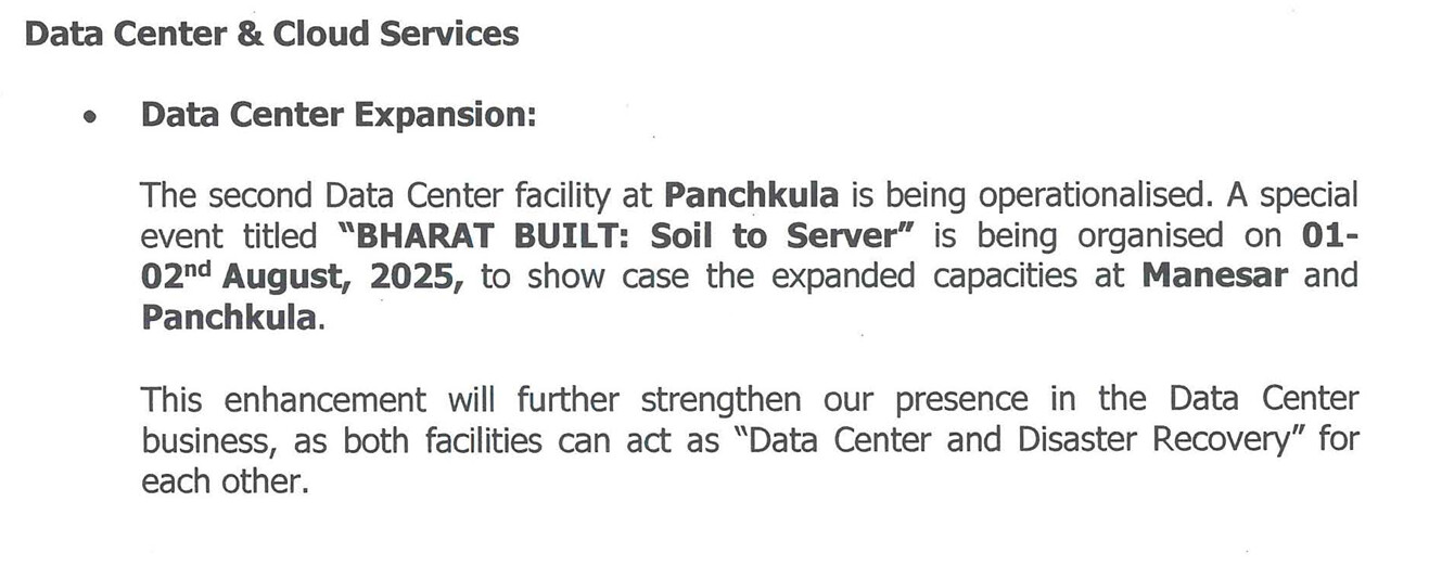 New Incremental Capacity of 22 MW IT Load at Panchkula & Manesar, ready to be operationalized from 1st August.