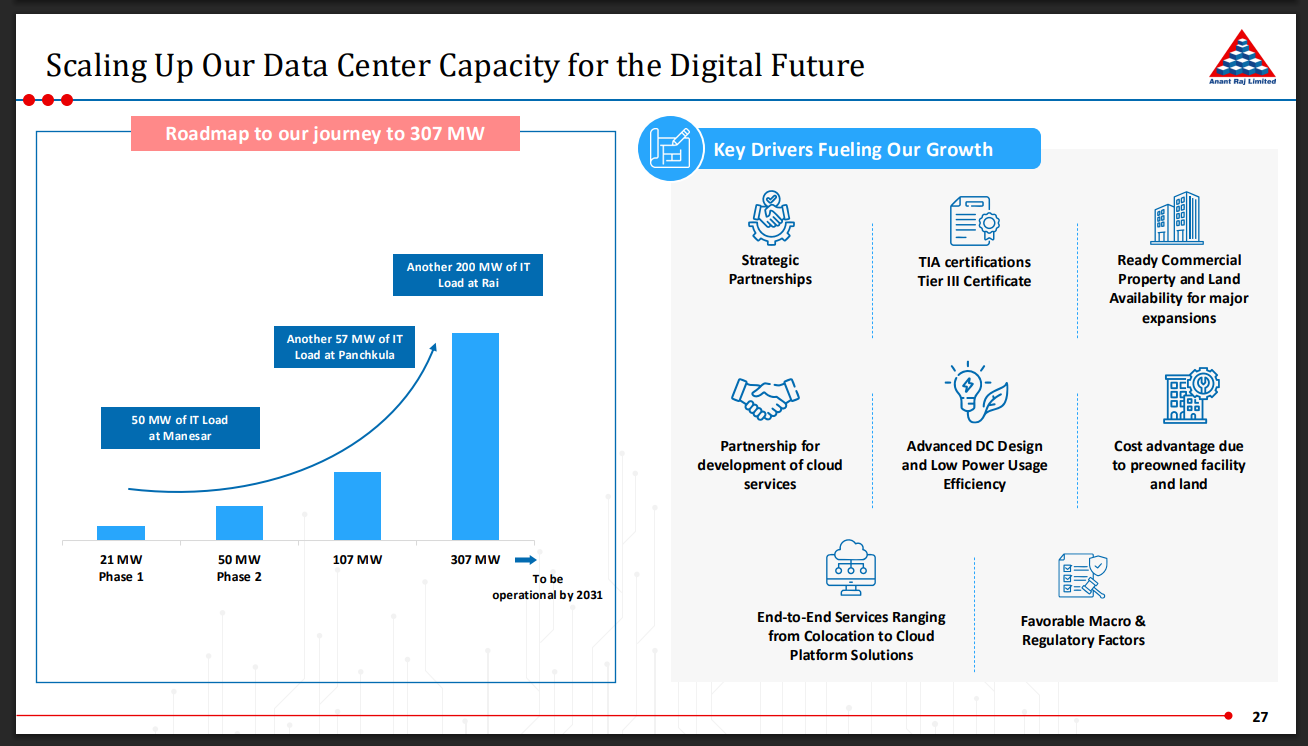 Thanks for sharing. From their AR and this, looks the Co is planning to go heavy on cloud which has 4-5X more potential than co-location (see table below) . Anyone from a tech background here - Can you shed light on how they stack up against hyperscalers? Is this the right capital allocation? Likes of AWS, etc are far ahead in the game offering entire spectrum and using AI; whereas Anant Raj is a late entrant. From my research, I understand that Anant Cloud is compliant with Indian regulations/privacy norms. Trying to understand why would someone opt for Anant cloud over the hyperscalers? Thanks in advance