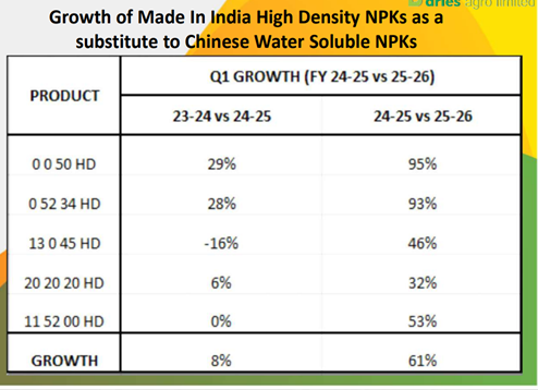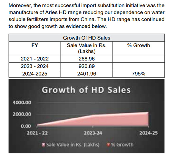 Aries is progressively reducing its import dependence. Moreover, the most successful import substitution initiative was the manufacture of Aries HD range reducing our dependence on water soluble fertilizers imports from China. The HD range has continued to show good growth.