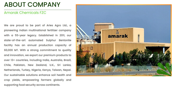 The company has signed a contract for a new Sulphur Bentonite facility in Jebel Ali UAE. Amarak Chemicals, part of Aries Agro, has announced plans for a new $14 million plant nutrients manufacturing facility in the Jebel Ali Free Zone. The new facility will specialise in the production of 60,000 metric tonnes of sulphur and allied value-added products annually.