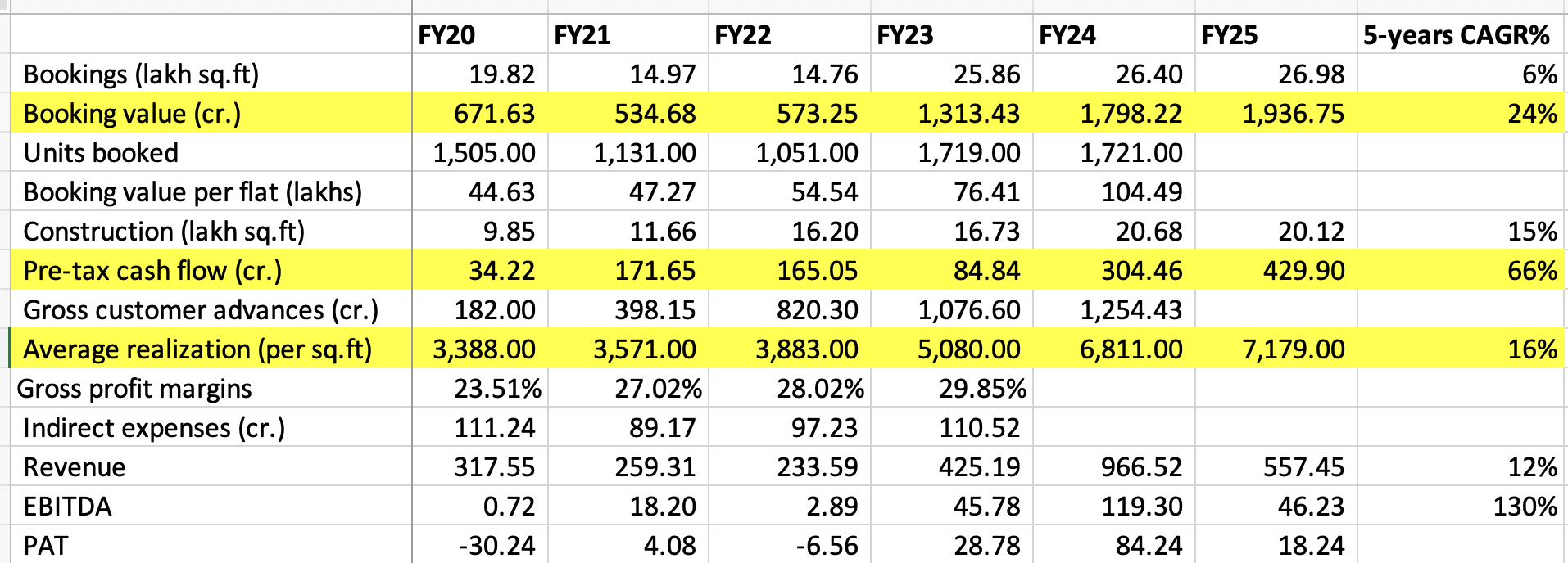 If we zoom out a bit, in last 5-years Ashiana has grown volumes by only 6% CAGR, but realizations have grown at 16% CAGR, reflecting a change in product mix (e.g., more sales in Gurgaon) and higher price realizations in their existing projects. Pre-tax cashflows has ballooned, growing at 66% CAGR! All these cashflows should be realized in terms of P&L in next few years (hopefully