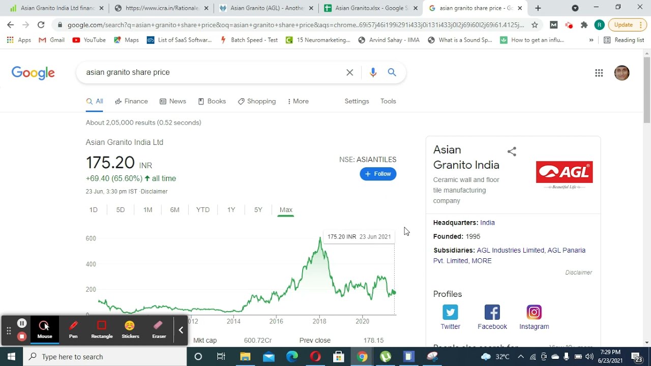 I called up dealers in Madhya Pradesh yesterday (6/20) – Katni, Guna, Sagar, Indore, Ratlam – and all of them said AGL’s business is going strong. One of them said that AGL is now #2 after Kajaria (I didn’t ask and he didn’t tell the measure on which AGL is #2).