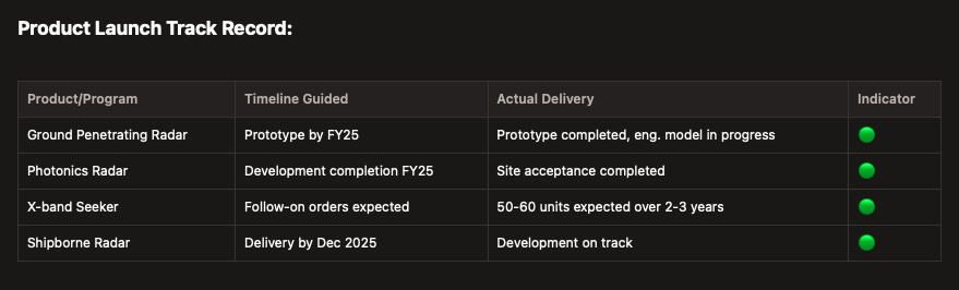 - B2G risk : Revenue is dominated by Indian defence B2G programs where DRDO specs and L1 tendering drive awards. Delays in orders for subsystems remains a major risk factor