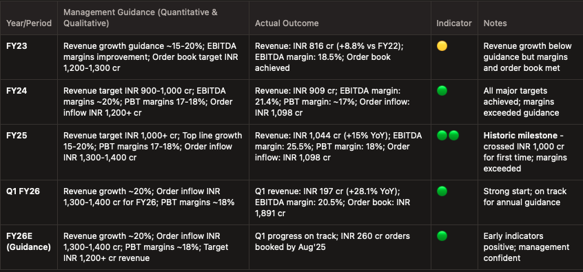 For FY26, management guides to ~INR 350+ crores revenue with PBT of 10% and an order book already INR 400‑plus crores, with visibility to secure close to $100 million across three major contracts before March ’26 and potential aggregate inflows of 800 crores.