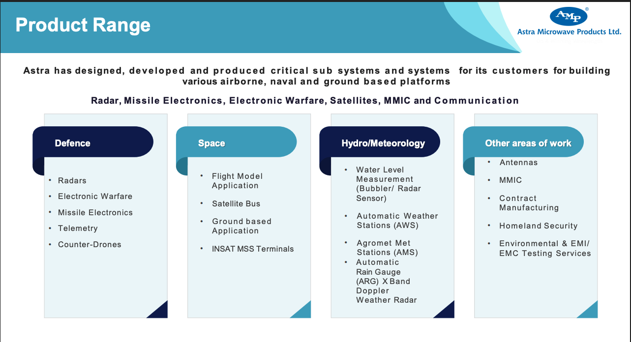 Astra microwave products is a manufacturer and designer of high performance Radio frequency (RF) and microwave modules, sub-systems and systems. It’s products find application in defense, space, meteorology, homeland security systems integration and unmanned ground vehicles and is steadily moving up from components/sub‑systems to full systems and solutions, especially in radars and weather applications.