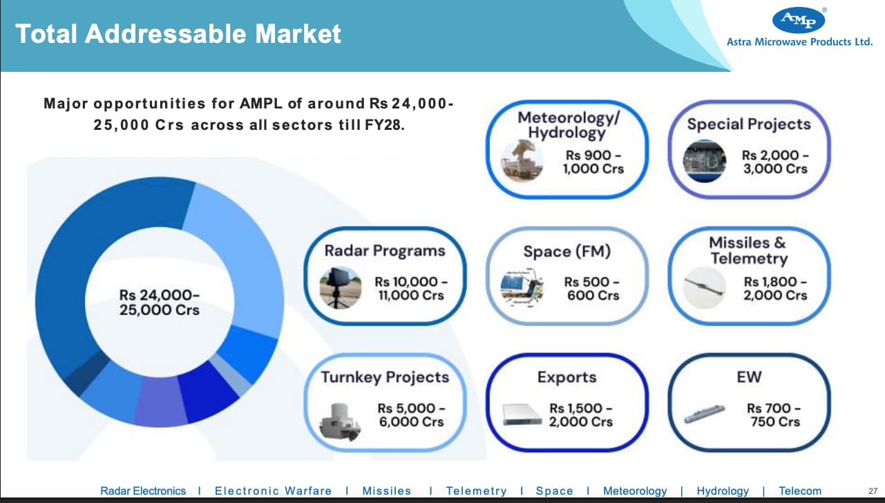 Astra Designs, develops and manufactures components and sub-systems used in ground-based modules and Slevel (on-board) modules. Astra have been among the key players for the development of sub-systems for India’s Radar Satellite & Geosynchronous Satellite program, Resourcesat, Megatropics and Cartosat for Indian space programs by ISRO. Astra has a order book of 239cr as of 1Q26 end from space sector. Opportunity size in this segment is close to 600crs till FY28.