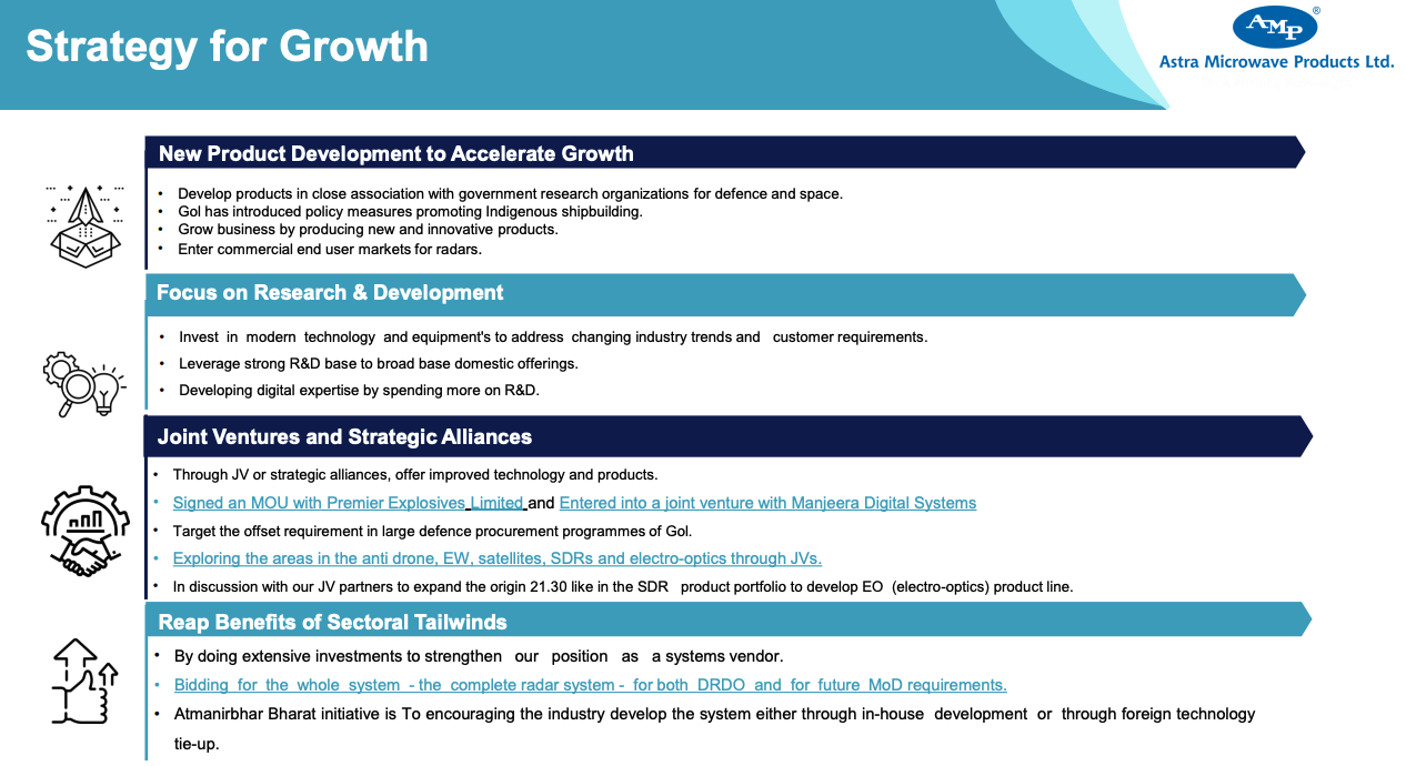 Astra Space Technologies Private Limited: This is the Company’s wholly owned subsidiary engaged to carry on the business of design, development and integration of satellites, satellite pay loads, launching of satellites, and establishment of ground stations for satellite tracking. Management also noted that a leading defence PSU formed an SPV with Astra to bid a specific space tender.