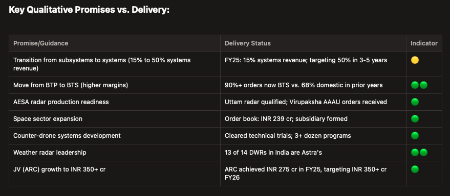 order book for astra stands at Rs 1,891 cr as of 1QFY26 (standalone), with 90% + of orders being BTS (higher value-add/margins). New wins included AAAU for LCA Mk‑2 and Su‑30 and radar sub‑systems for Akash Prime and VL‑SRSAM, plus weather radars and agro‑AWS for IMD. Management guided FY26 order inflow of Rs 1,300–1,400 crore, revenue growth near 20%, and PBT margins around 18%, with systems (radar/EW, counter‑UAS) as the growth engines.