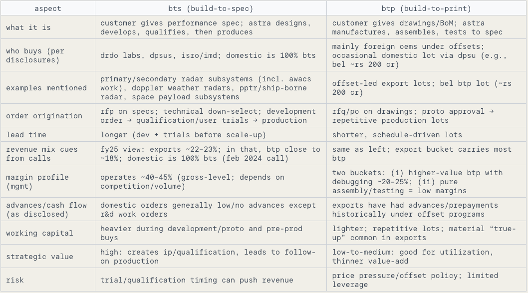 Build-To-Spec (BTS): customer gives a performance specification and then astra designs, develops, qualifies, and then produces the subsystem/system. BTS has a higher value add and provides better margins to Astra. Company here works with systems integrators like DPSUs (Defence Public Sector Undertakings) and others for commercialization of the products.