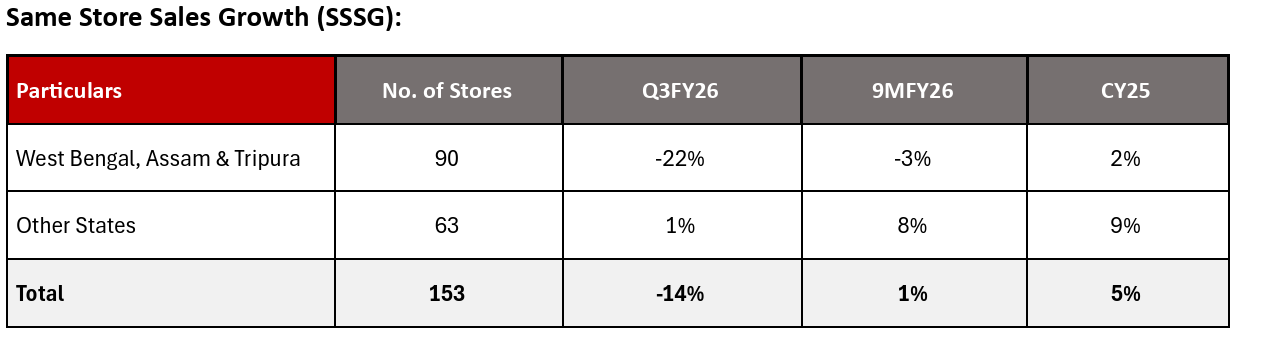 Sales per sq ft: Approx 800 when company is present in WB , Bihar , Orissa and Assam . As the company moves towards northern belt sales may increase due to per capita and Winter effect.