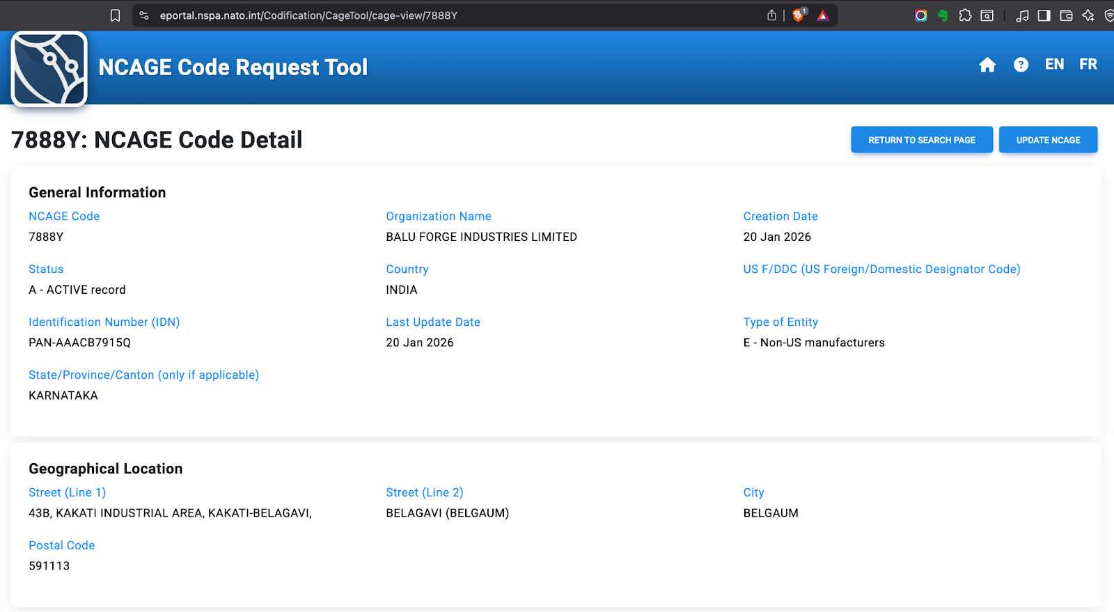 NCAGE code verified at https://eportal.nspa.nato.int/Codification/CageTool/cage-view/7888Y