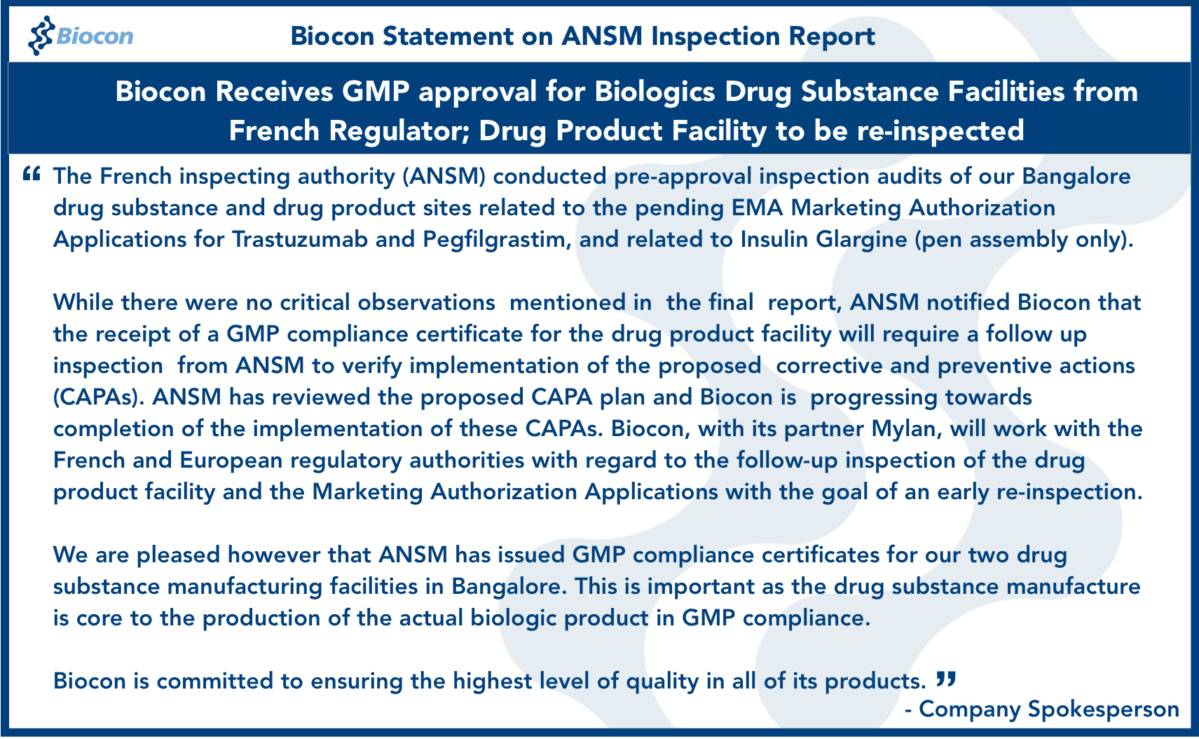 Inspection authorities letter says non compliance of GMP (General manufacturing practices) and biocon says