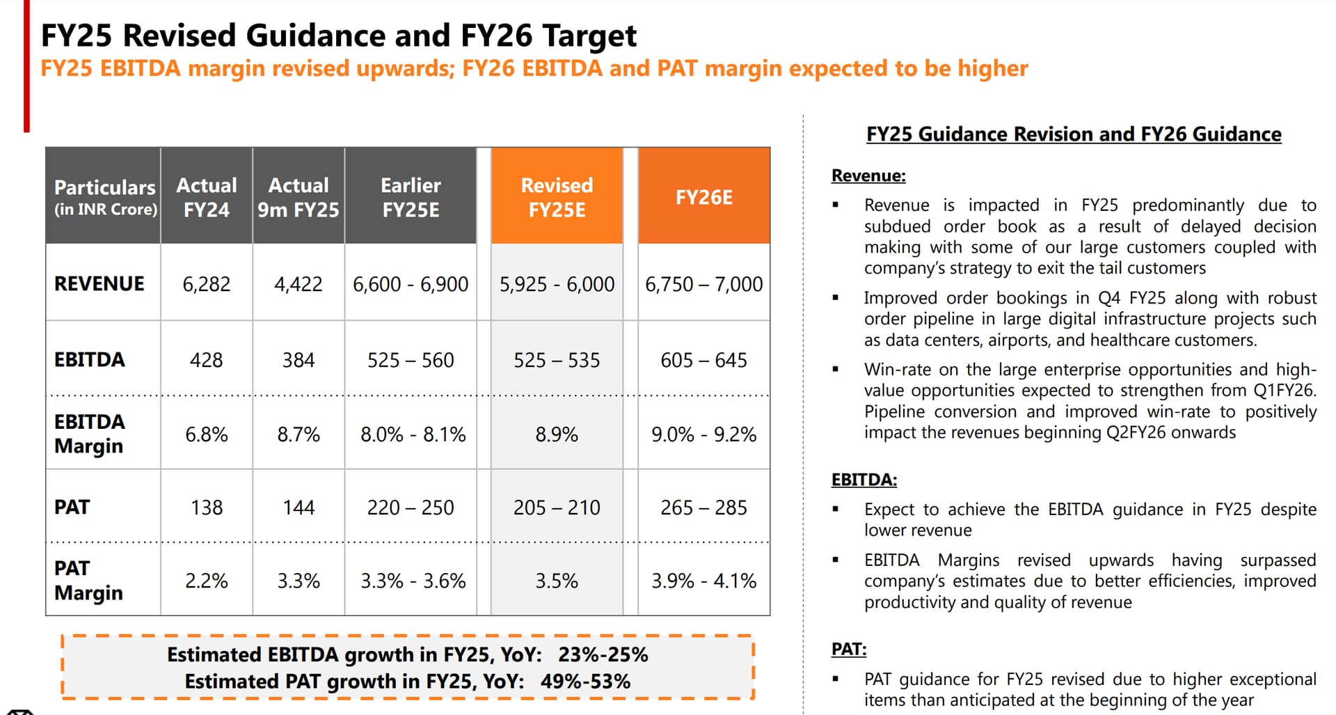 Conservatively assuming management can achieve a modest 15% topline growth for the next three years—reaching Rs. 9,500 crore (against the guidance of $2 billion)—and increase EBITDA margins to 9% (against the guidance of 10%), compared to Q4 EBITDA margins of 8.2% and full-year FY24 margins of 6.8%, EBITDA would increase to Rs. 855 crore, doubling from EBITDA of FY24.