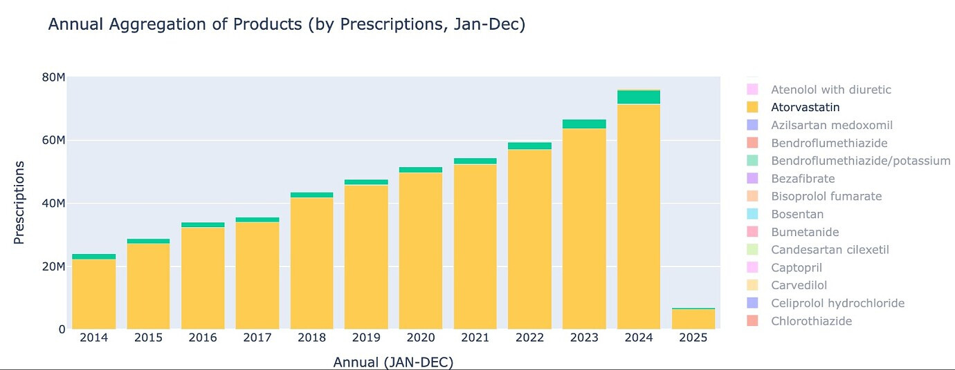 The primary cholesterol lowering treatment in the UK is Atorvastatin. As of Jan 2025, around 6.3 million prescriptions of Atorvastatin were dispensed, roughly ~10% of the population. This market is growing at around 10% CAGR, and Atorvastatin is the most prescribed drug in the UK.