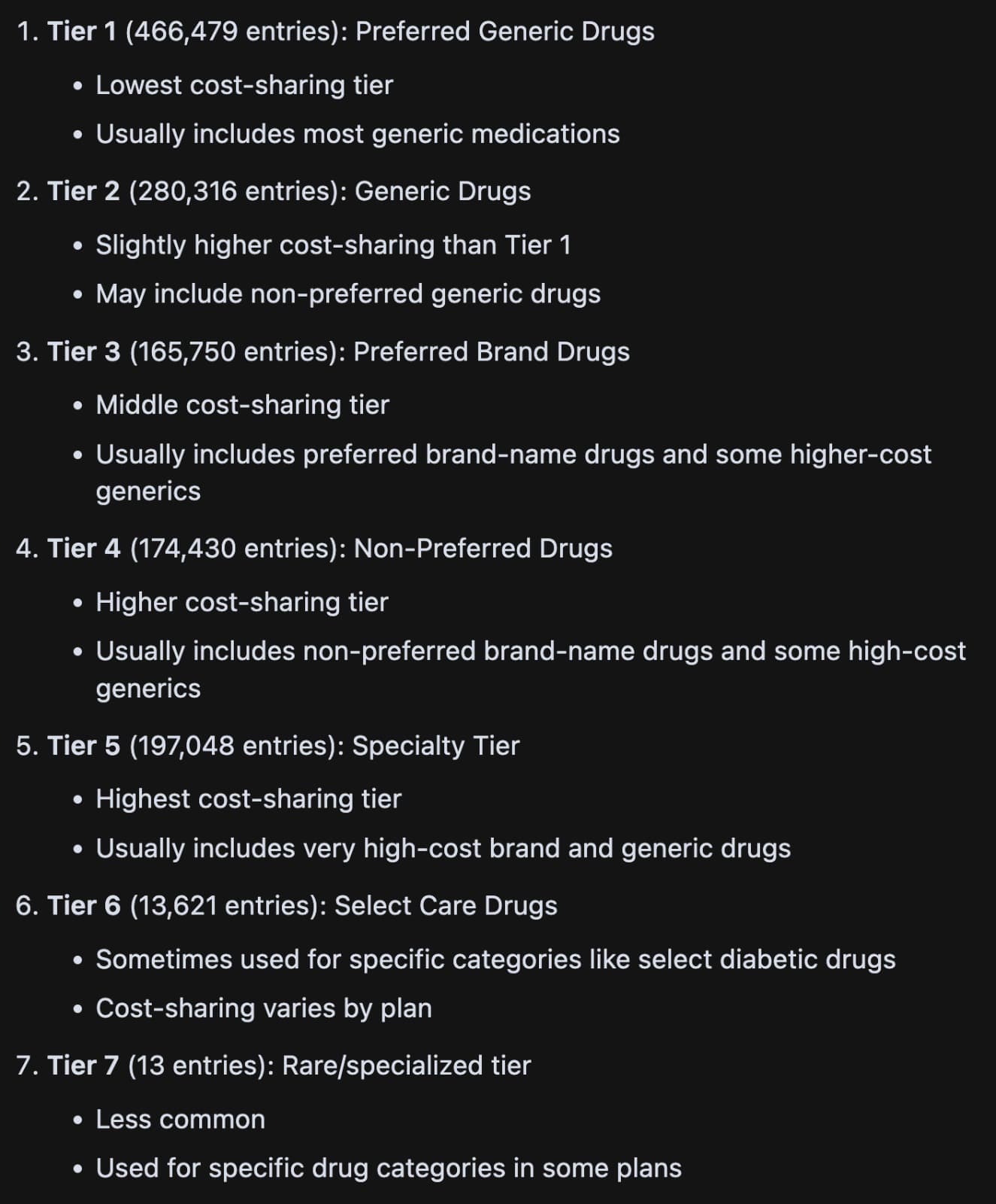 This would give us a fairly good idea of how the drug is covered by various formularies (simply a combination of drugs, which is attached to plans). There are however some basics about US insurance plans we need to understand. Drugs fall under different tiers from Tier 1-7.
