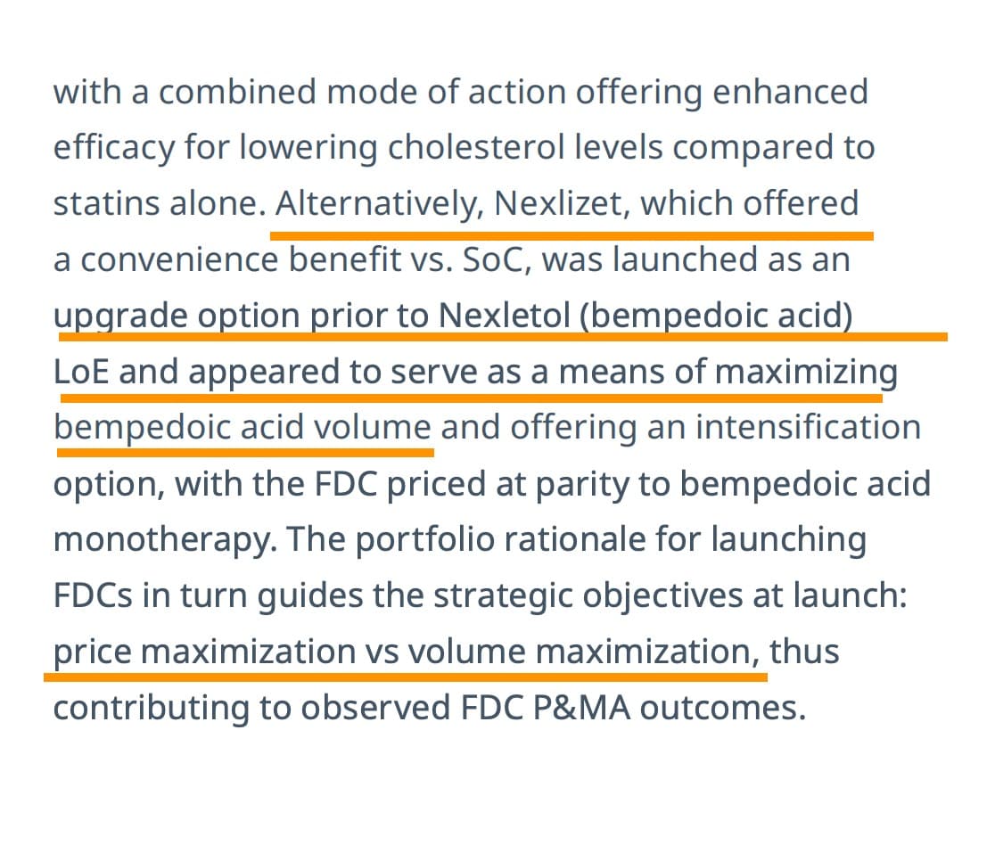 When a branded drug is combined with generic as in Nexletol (BA) + Zetia (Ezetimibe), then pricing diff between FDC and branded drug is negligible. Thats why Nexletol and Nexlizet are priced exactly the same. This works out well for the payer (insurer) who can pay less. It also makes sense as formulation, packaging, distribution cost of 2nd drug is saved