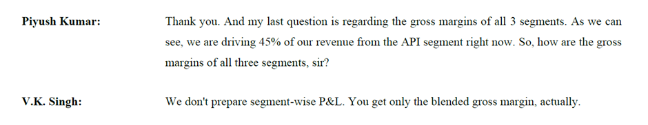 Yes, they are not required by SEBI to disclose segment wise gross margins in their earnings calls or filings unless those segments are reportable under Ind AS 108 (Operating Segments).
