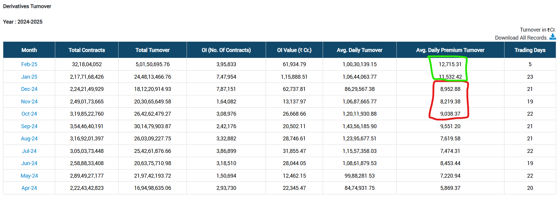 a quick note, do see the increase in Premium TurnOver on monthly basis in Jan’25, Feb’25 versus Oct-Dec’24. I know we are not even covered 50% of the trading days yet, but Q4 looks promosing from Derivatives premium turnover data perspective.
