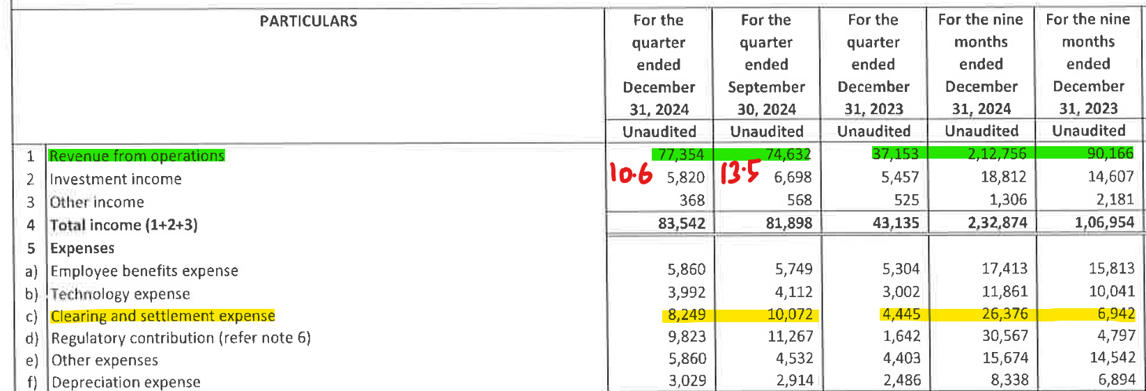 In Q3 clearing expense is 82 Cr versus 100 Cr in Q2, although revenue went up. Q3 clearing expense is 10.6% of revenue versus 13.5% of revenue. I do not have a clear idea when the contract resizing happenend in Q3, think it was towards end of Nov, - Nov 20th, so the reduced clearing charges impact is only partial. If Nuvama is correct, then reduction could be as much as 2/3rd. The 100 Cr for Q2 is for all segments, so not sure what was derivatives share. 2/3rd of this cost might be the saving on a full quarter basis for similar volume.