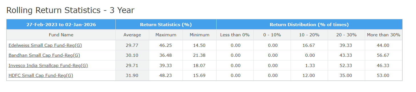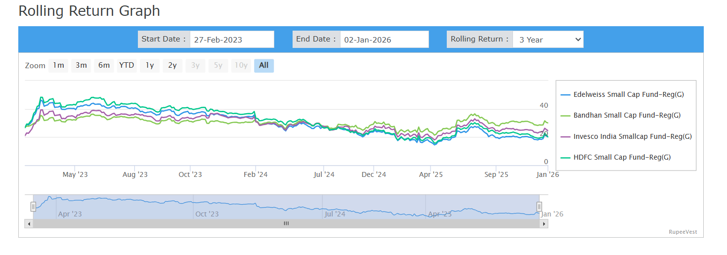 HDFC small cap → HDFC had been on top from 23 to mid-24 and is also doing well. Also, their average RR is the highest.