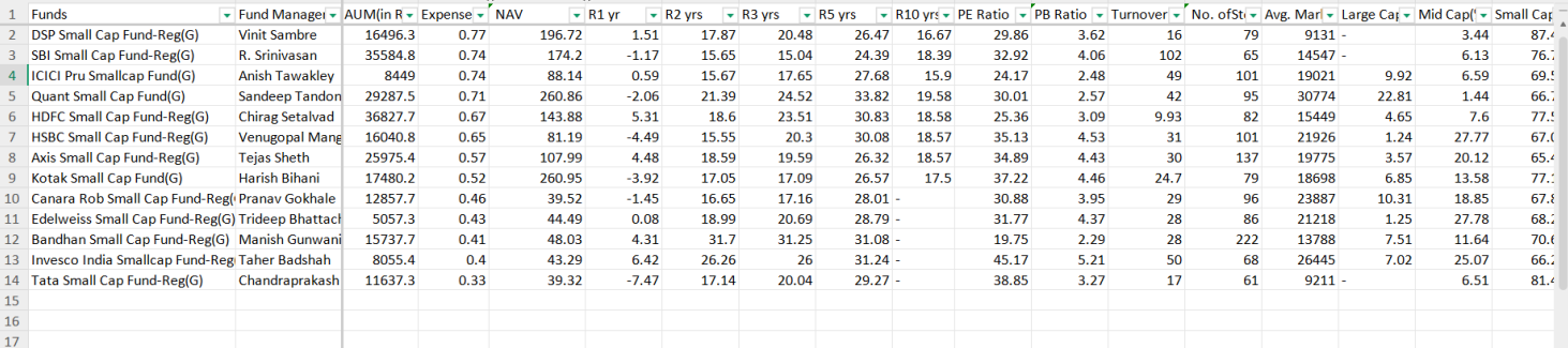 - So I have data of a total of 32 small-cap funds. downloaded from Mutual Fund Screener | RupeeVest.