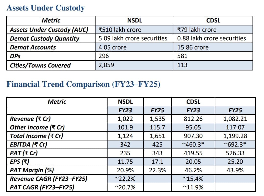 - nsdl is more institution-driven and integrated into india’s financial system through mandates and corporate actions. it has larger assets under custody but operates less efficiently. ipo price at ₹750 implies ~44x pe.