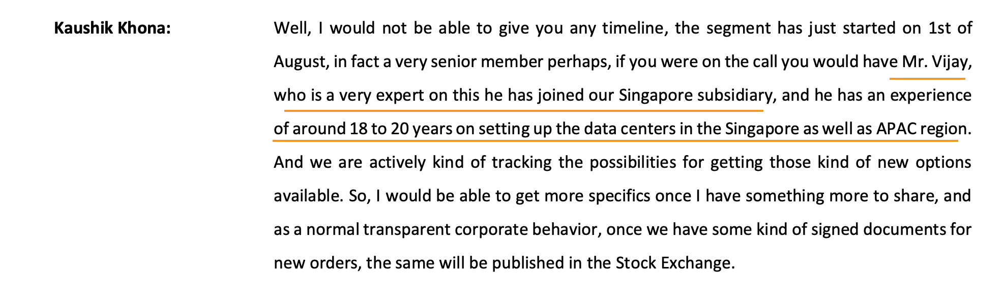 - Singapore entity has 0 revenues. Not much traction/focus on data centre business right now.