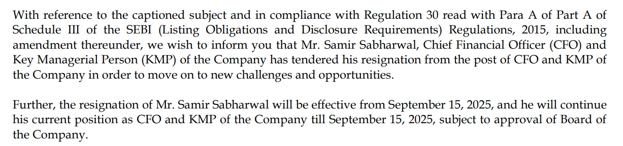 Ceinsys Tech Ltd. announced the resignation of Mr. Samir Sabharwal from his role as Chief Financial Officer (CFO) and Key Managerial Personnel (KMP). His resignation will be effective from September 15, 2025. The company stated that Mr. Sabharwal is leaving to pursue new opportunities.