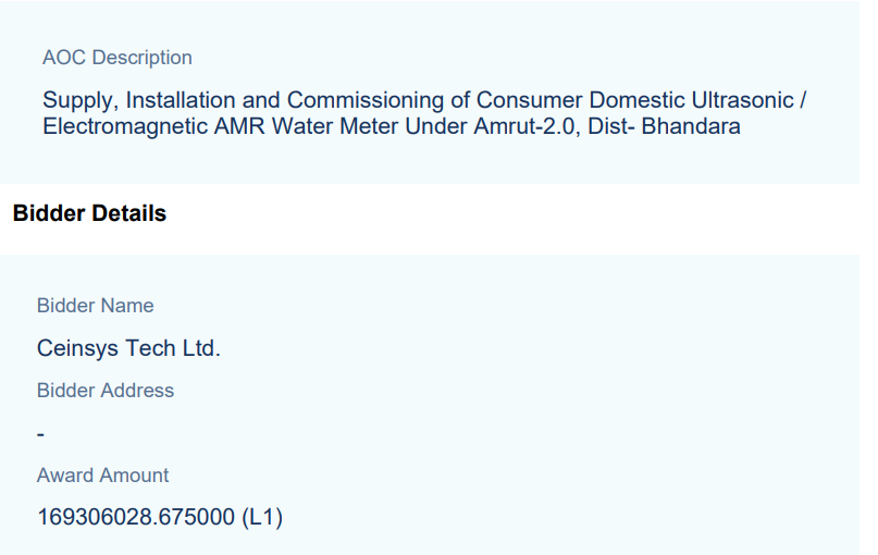 Ceinsys is the probable AOC for the installation of water meters, further strengthening its presence in the water sector. The company has prior experience in this domain, having successfully executed similar project in Thane: Smart Water Meters - Thane.