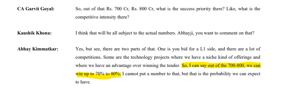 Abhay Kimmatkar: Yes, but see, there are two parts of that. One is you bid for a L1 side, and there are a lot of competitions. Some are the technology projects where we have a niche kind of offerings and where we have an advantage over winning the tender. So, I can say out of the 700-800, we can win up to 70% to 80%. I cannot put a number to that, but that is the probability we can expect to have.