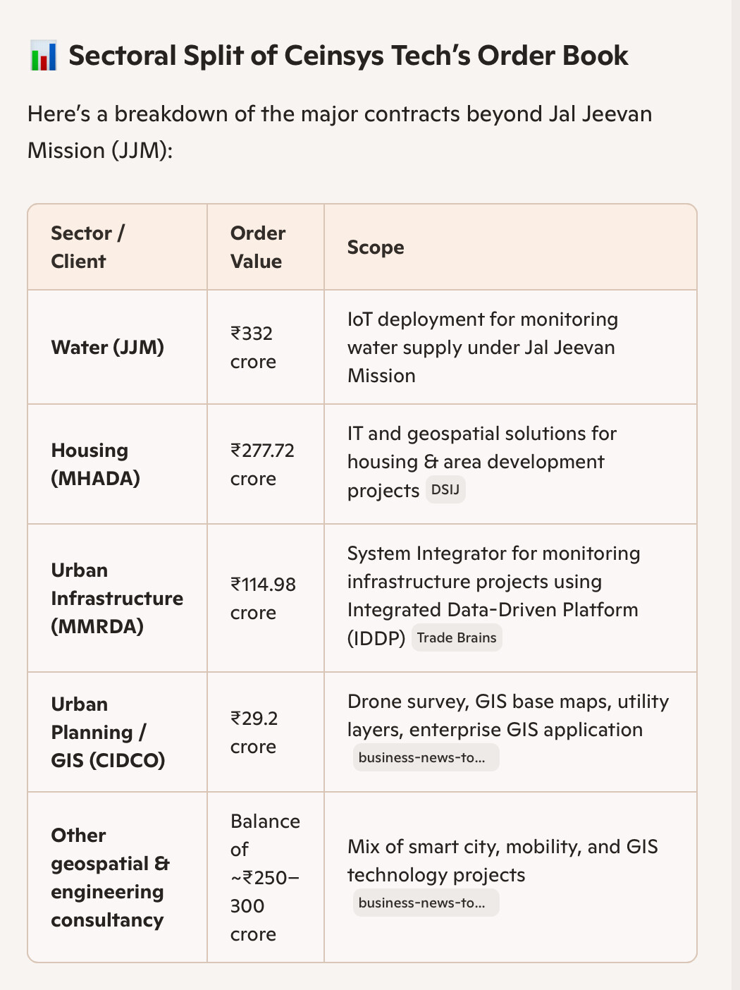 Its not all JJM and its not pipeline fitting work either .Ceinsys has lot of other things under the hood apart from what the public perception is .Their US aquisitions allygrow and VTS is also into auto sector and has Lidar etc. capabilities .