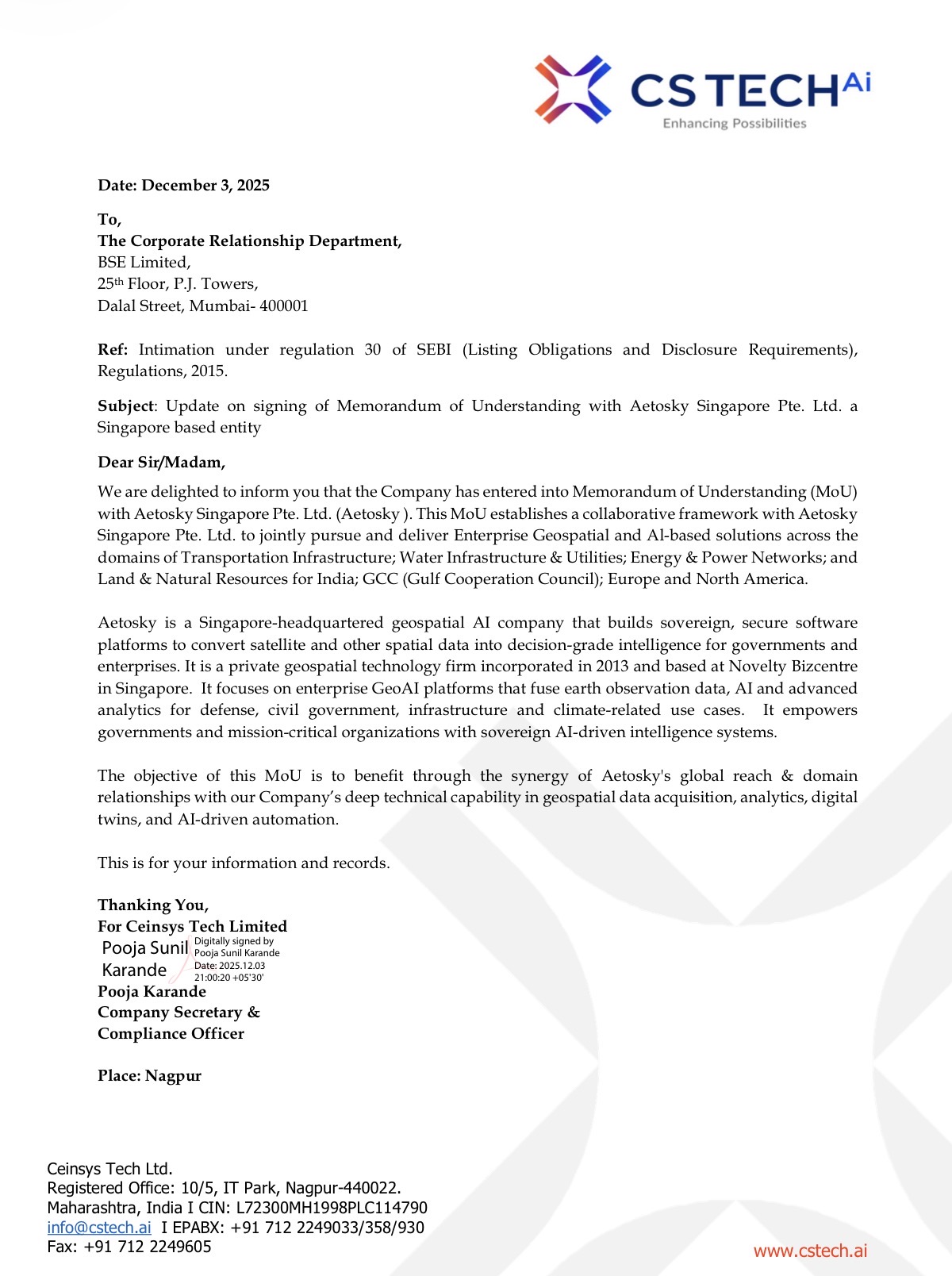 Ceinsys Tech Limited has informed BSE that it has signed a Memorandum of Understanding (MoU) with Aetosky Singapore Pte. Ltd., a Singapore-based geospatial AI company.