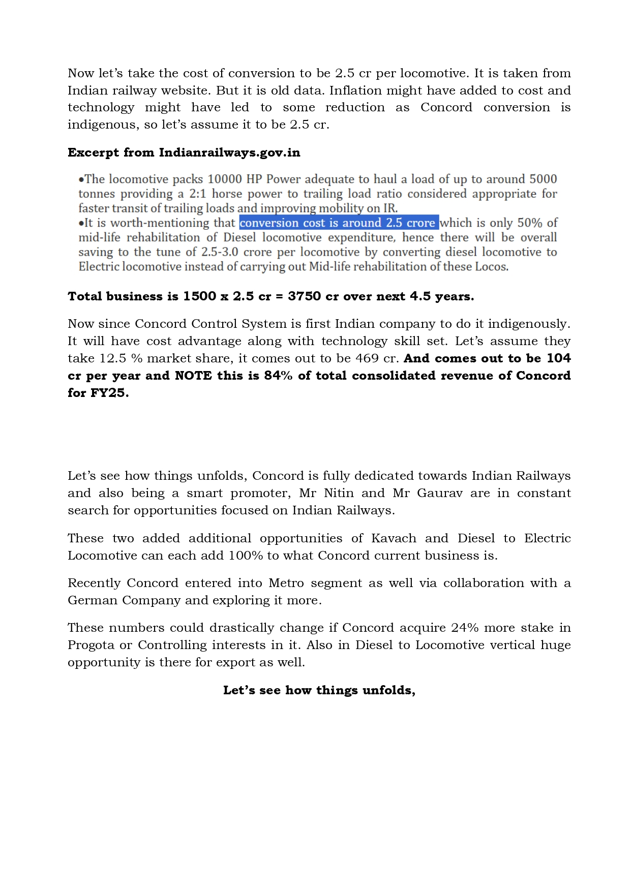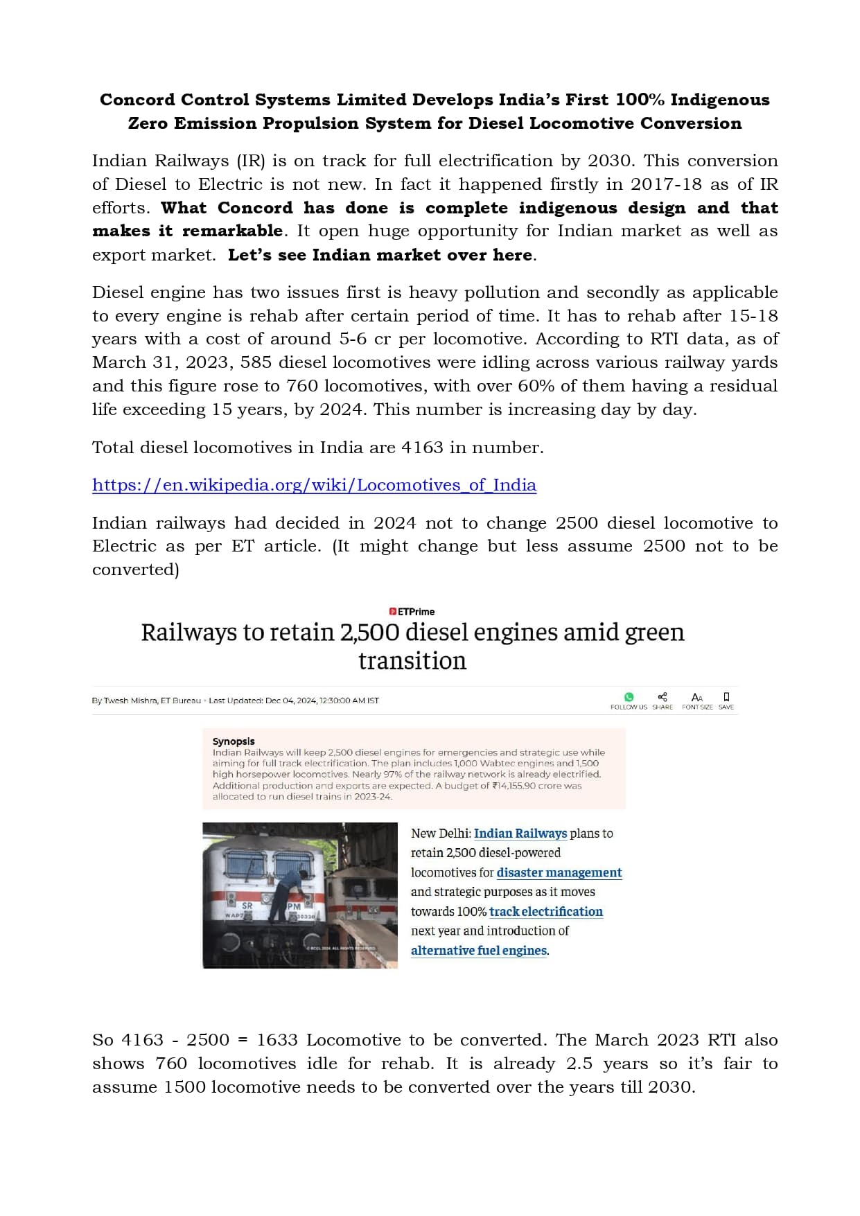 Diesel locomotive conversion is good area. Indian railways have over 4000 diesel locomotive but Indian railway have decided to keep 2500 as it is and not change so TAM reduces drastically. Company should have given TAM as well.