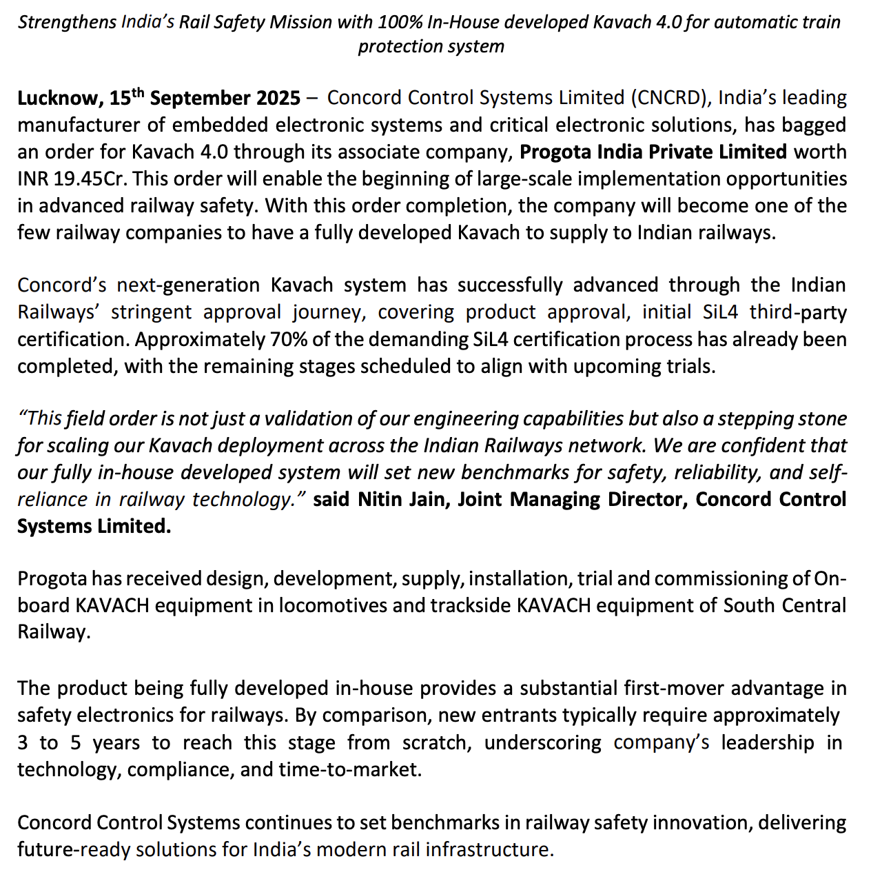 Concord Control Systems Limited Bags First Order of KAVACH 4.0 through Progota India