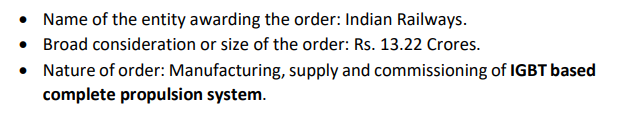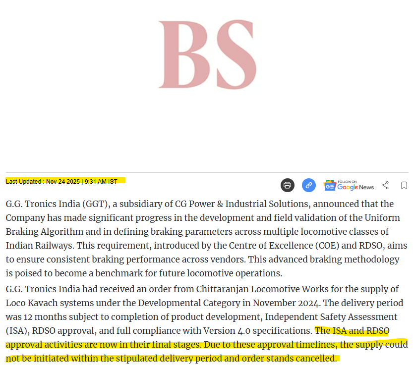 - In Nov 2025, 1 year post receiving the CLW order, they announced that their order stands cancelled because they could not get final approval before the contract expiry. At the same time they also mentioned that ISA and RDSO approval activities are in final stages.