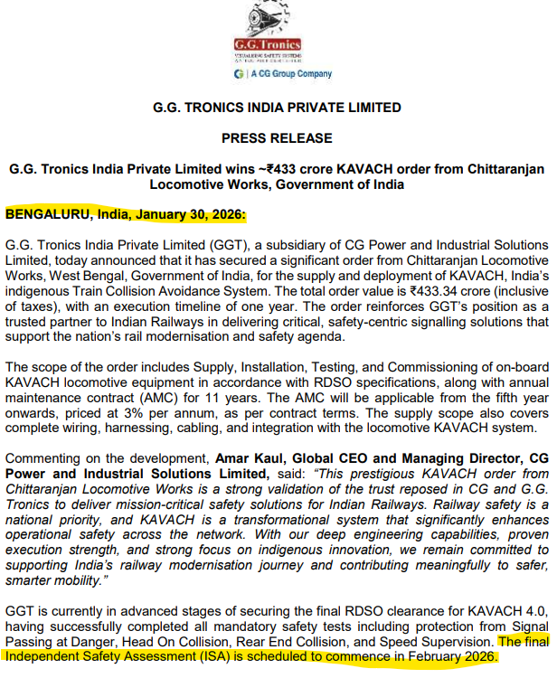 - On 30th Jan 2026 they announced a new order, worth Rs 433 Cr, from CLW. In the press release they mentioned that the final ISA assessment is scheduled to commence in Feb 2026.