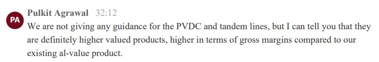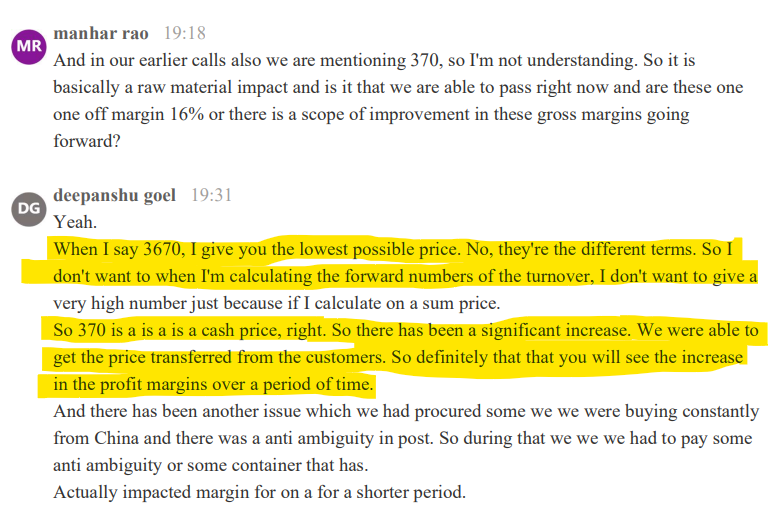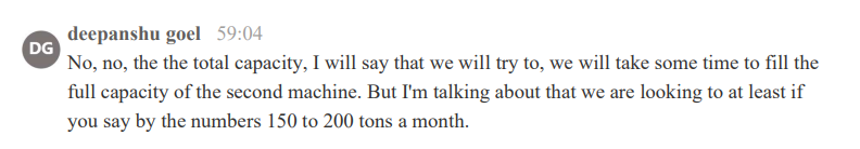 - The company stocked inventory around Q3 FY25, which could lead to inventory gains in H2 FY25. However, margins in H1 FY26 may be depressed due to front-loaded costs from the upcoming capacity addition.