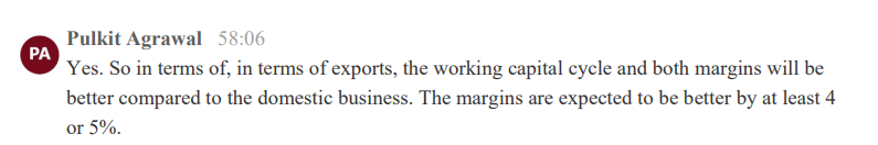 - Exports allow 100% LC discounting, improving cash flows. With a better client mix and predictable offtake, Wahren can achieve working capital gains.
